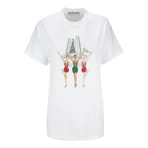 Celebrate your season in style our Rockettes Bling T-Shirt! Featuring a dazzling, intricate drawing by the renowned social media artist Holly Nichols, this artwork beautifully showcases three spectacular Rockettes in front of the historic Radio City Music Hall and the iconic bejeweled Christmas Tree.